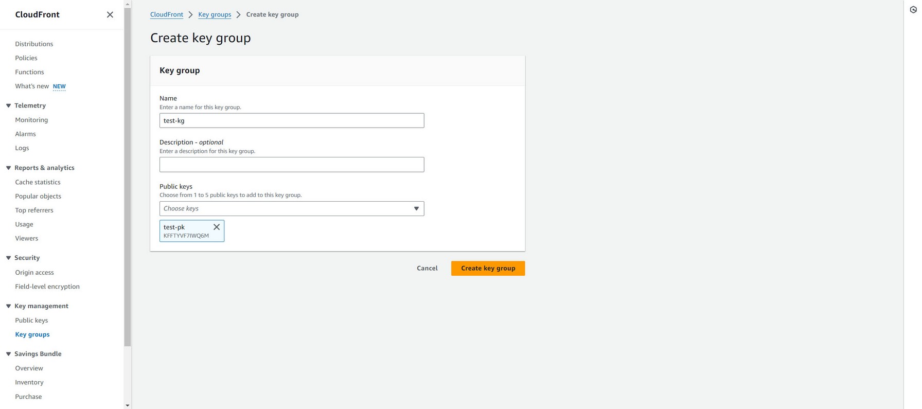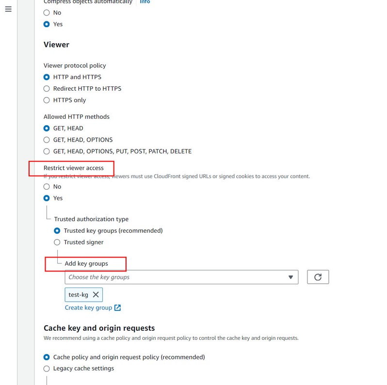 Under Restrict viewer access select Yes, and choose Trusted key groups, and select Key group you have created in previous steps in dropdown menu.
