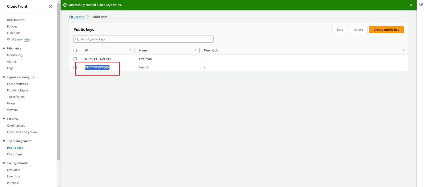 Copy distribution domain name as Cloudfront domain url and Public key pair ID into credentials, and set Use Cloudfront option:
