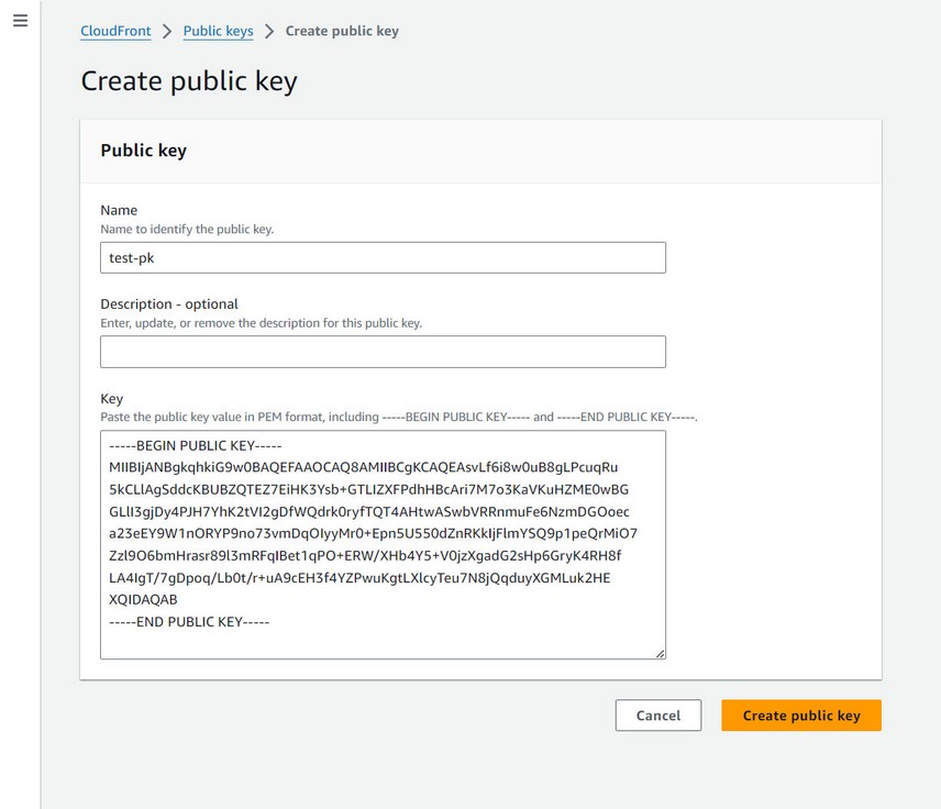 Give it some name, then open public key (you downloaded from the previous step) in any text editor and copy its content inside Key field. (Paste this public key value in pem format...). Make sure its a public key you copy not a private key!