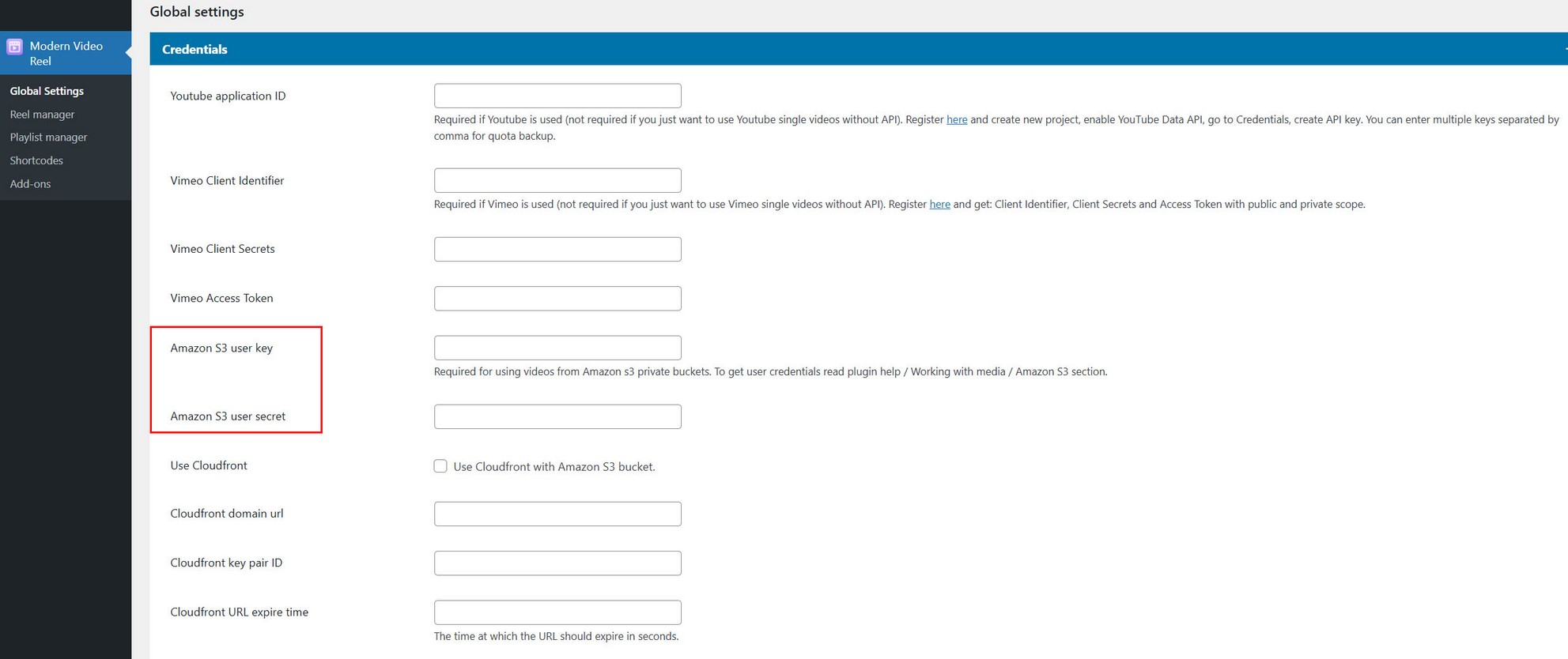 Copy distribution domain name and Public key pair ID into credentials, and set Use Cloudfront option: