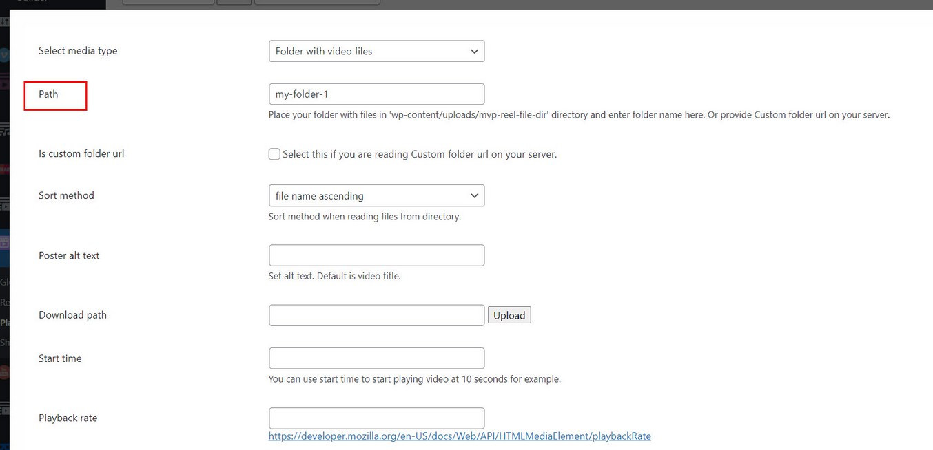 Place folder in wp-content/uploads/mvp-reel-file-dir directory and enter folder name in field:
