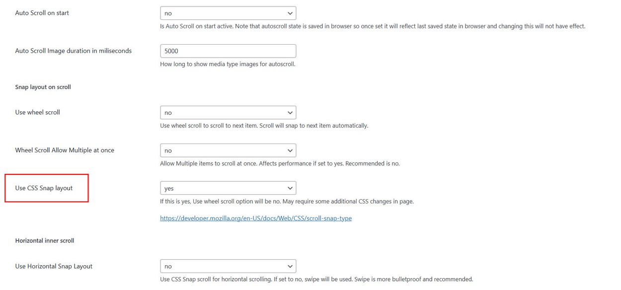 If you try to replicate this example with Snap Scroll https://interactivepixel.net/env/mvp_reel/content/reel_snap.html , and this does not work, this may be due to your theme or 3rd party plugins use wheel event in page and prevent normal scroll, like for example: