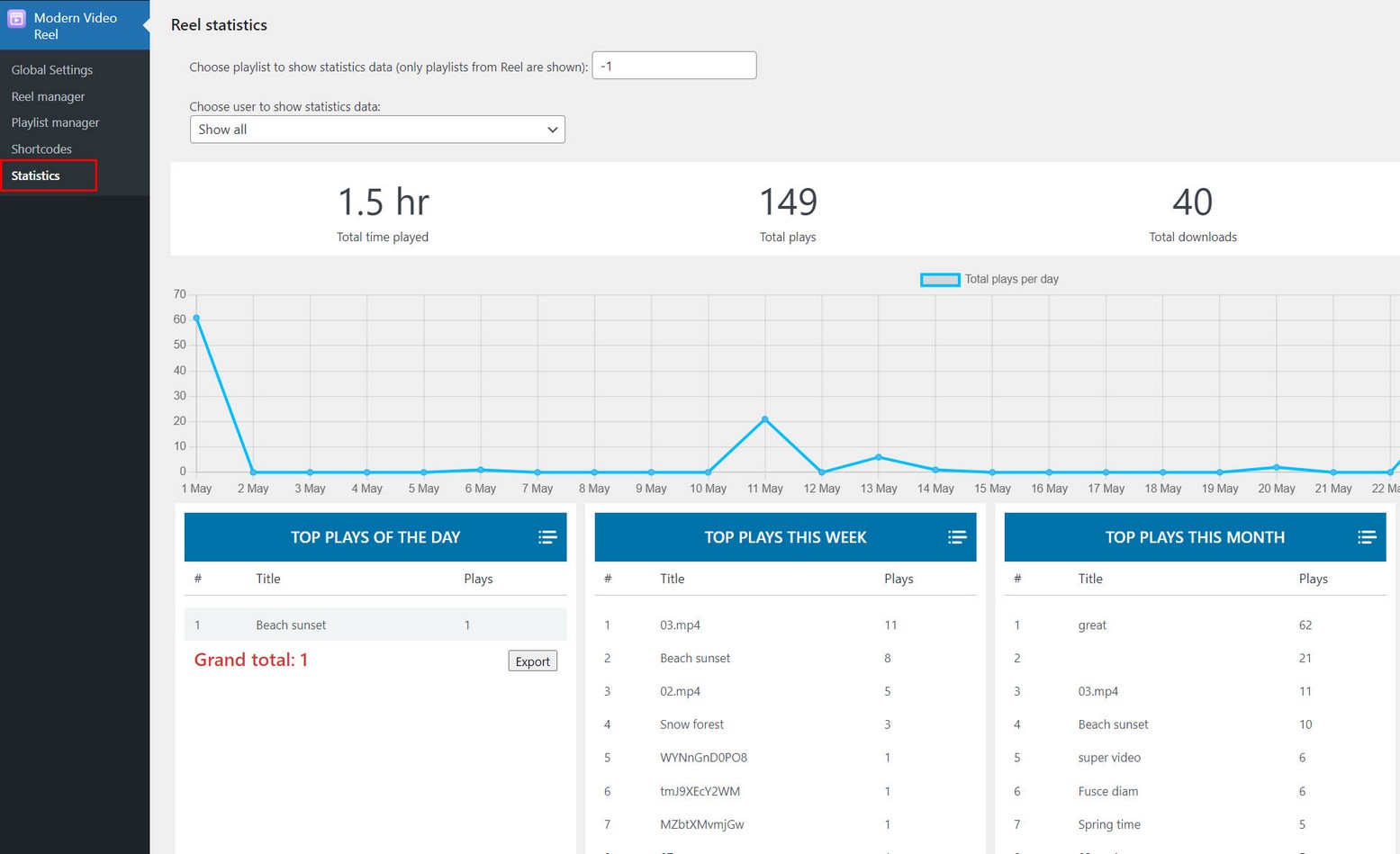 Using Statistics addOn for Modern Video Reel For WordPress you can track video statistics for your Reels.