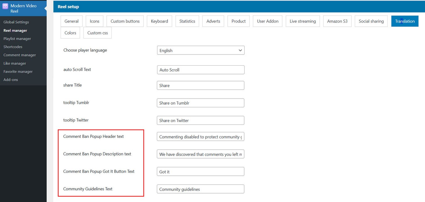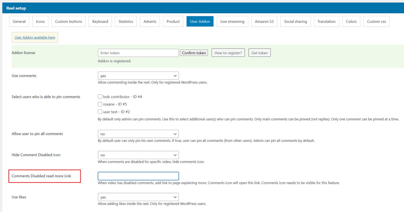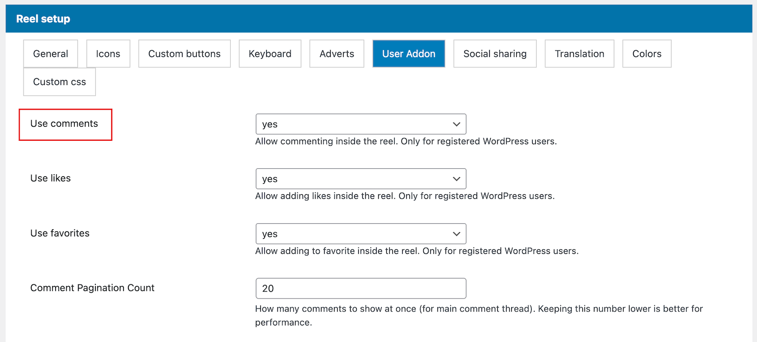 Enable comments inside Reel manager / Edit Reel / User Addon tab