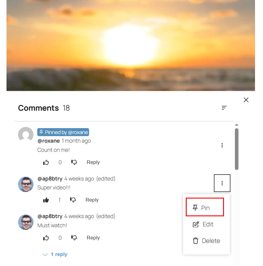 - allow specific user(s) to pin their own comments or all (per Reel)