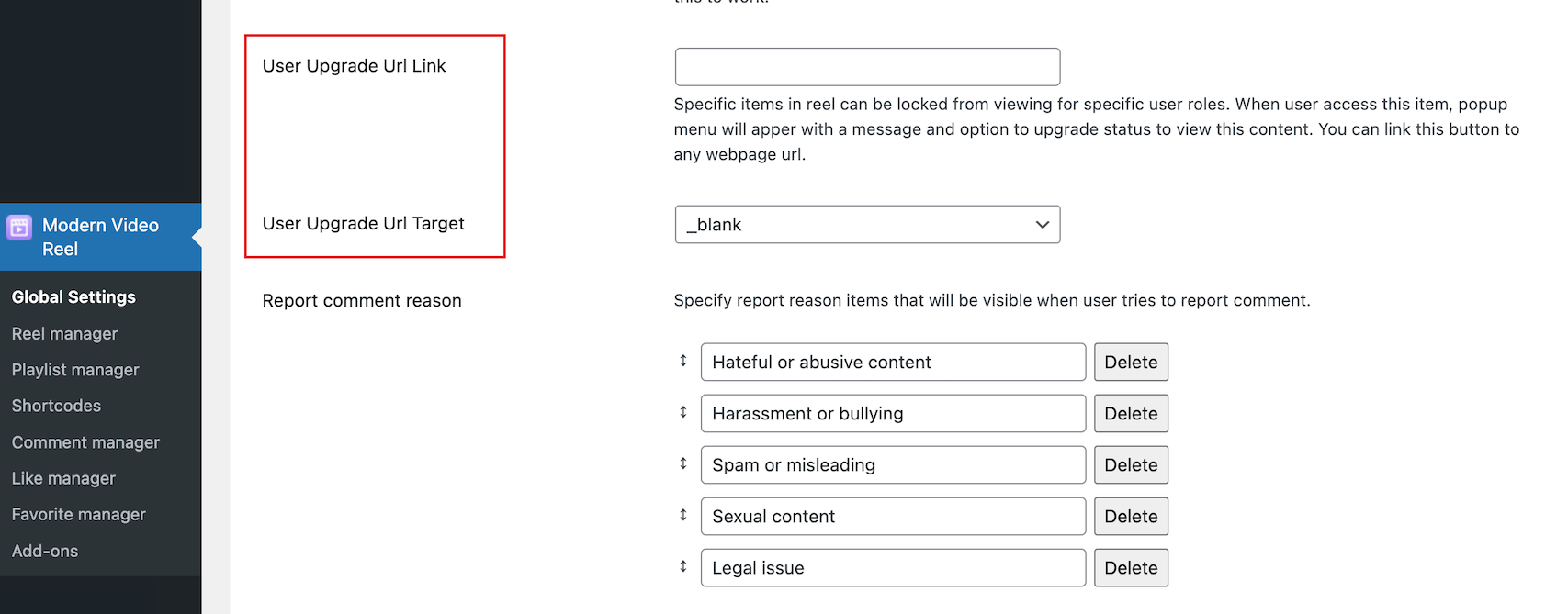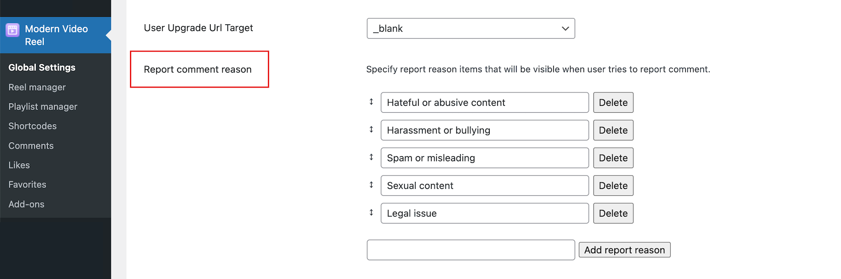 Admin can specify report reasons inside Global settings / User Addon tab .