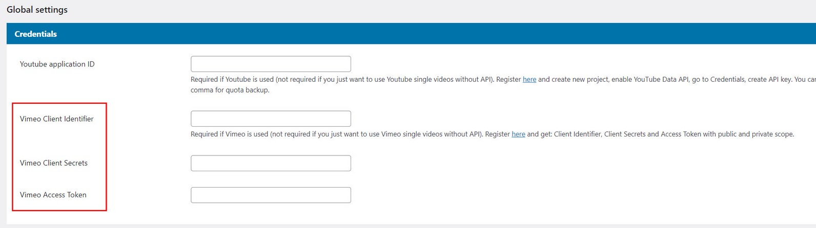1. Vimeo requires API key, register new application: https://developer.vimeo.com/apps/new