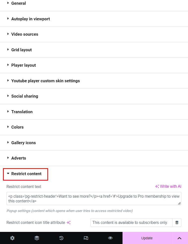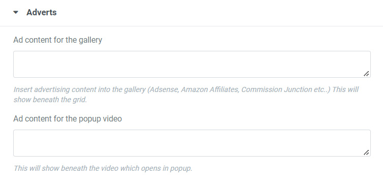 Use Advert tab to advertizing content to the gallery. You can add ad content that will be placed in the gallery below the grid. You can also add ad content that will be placed in the video popup window in lightbox.