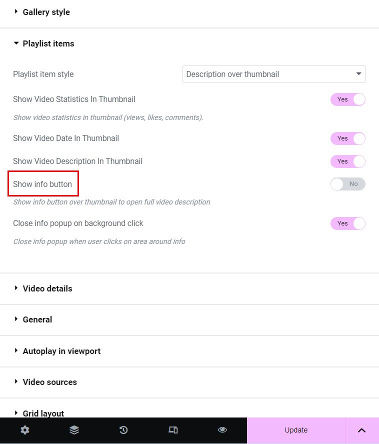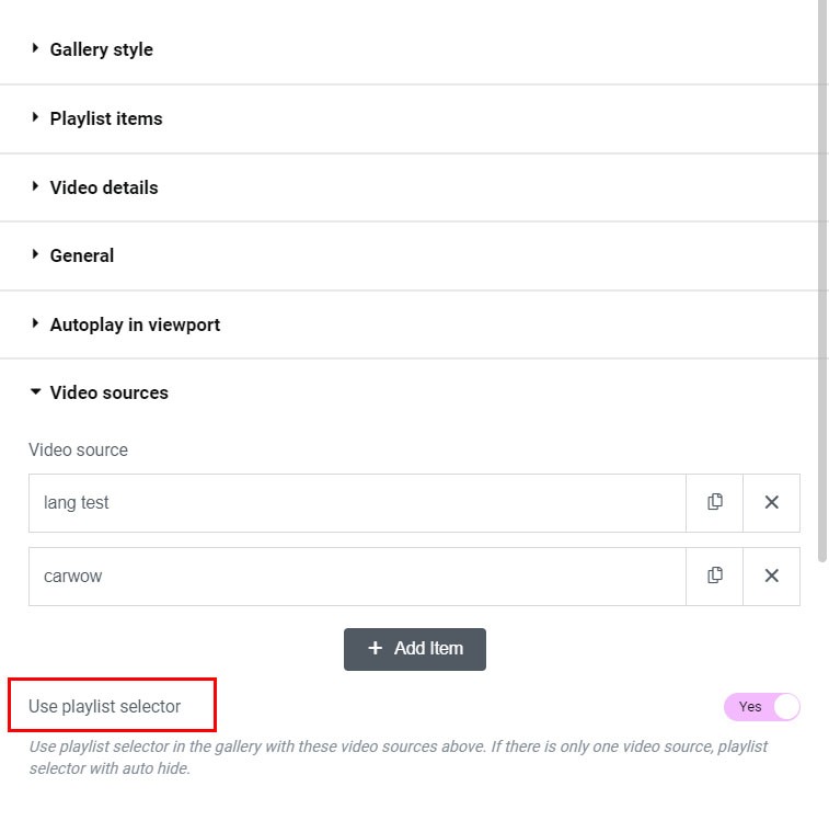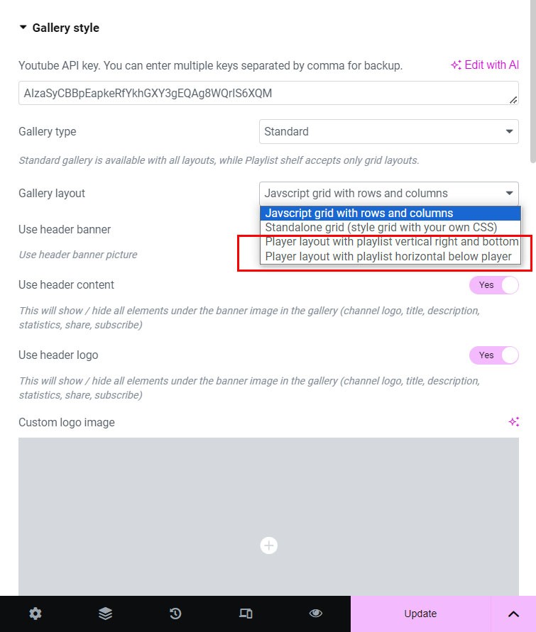 If you have more than single video source in the gallery, choose Use playlist selector and this will be shown above the player area. With this feature you can change Youtube channel or playlist in the gallery directly.