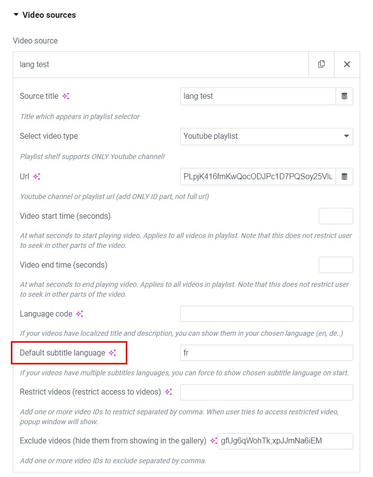 If your videos have multiple subtitles languages, you can force to show chosen subtitle language using Default subtitle language parameter.