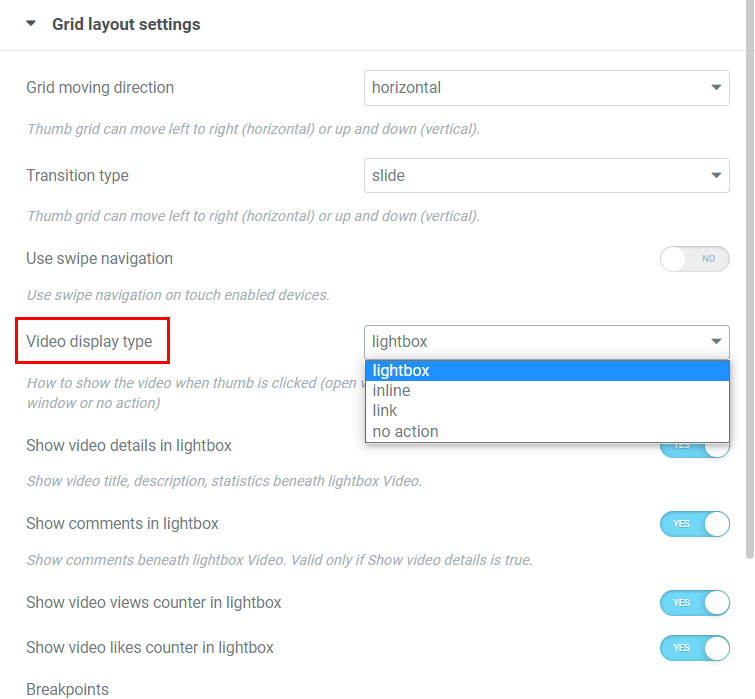You can also set Video display type, meaning how to display the video when the grid item thumbnail is clicked. Possible values are lightbox, inline, link and none.