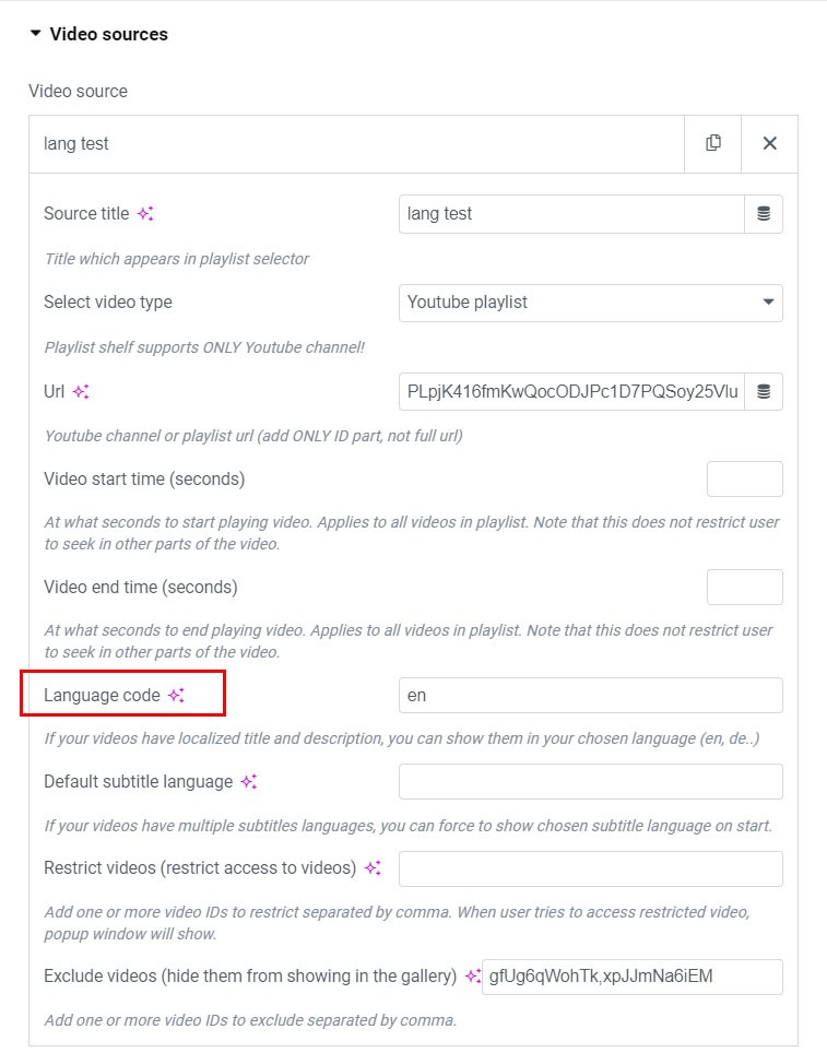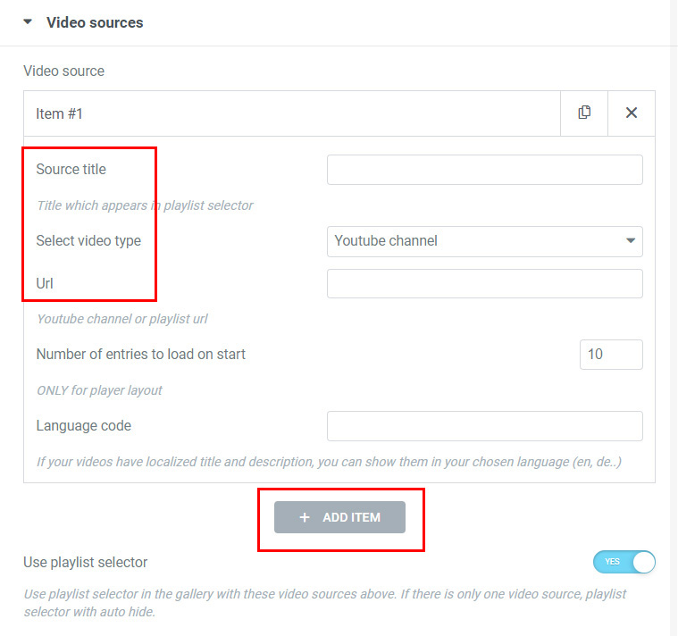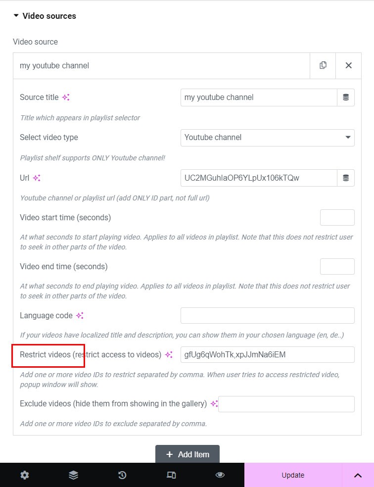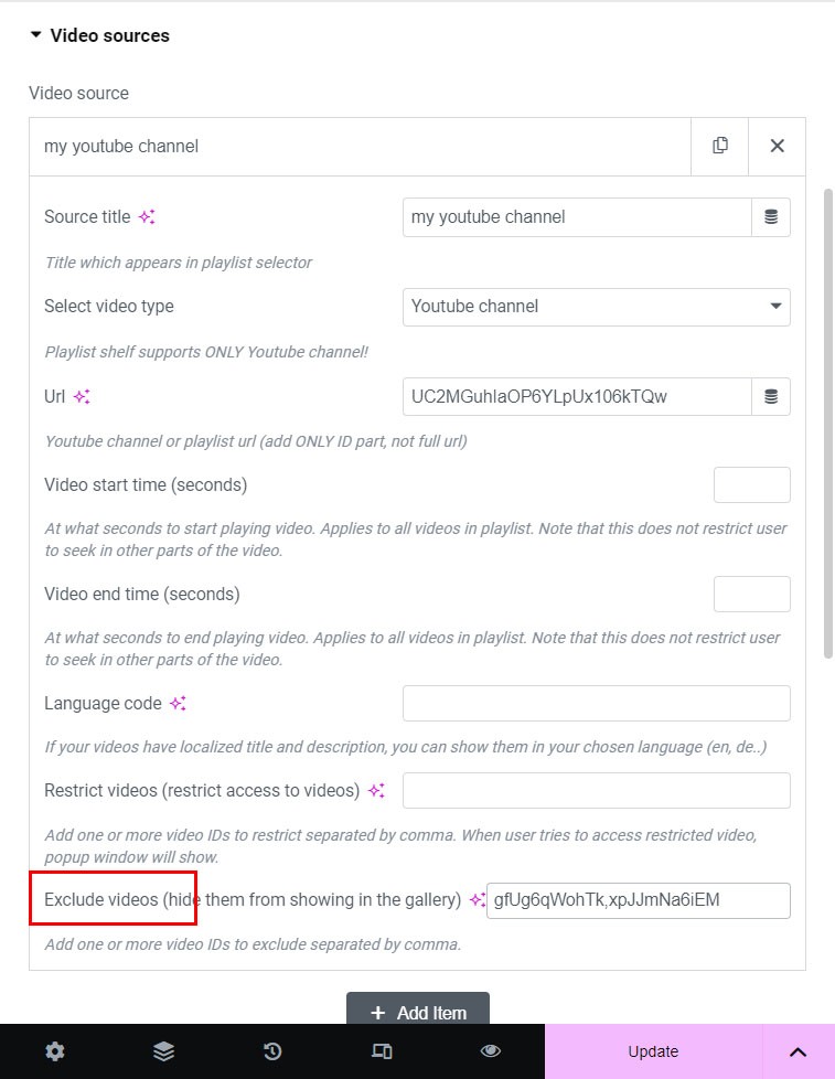3. In Video sources tab Add item, choose Youtube source and add url (ONLY ID part, not full url) and source title.