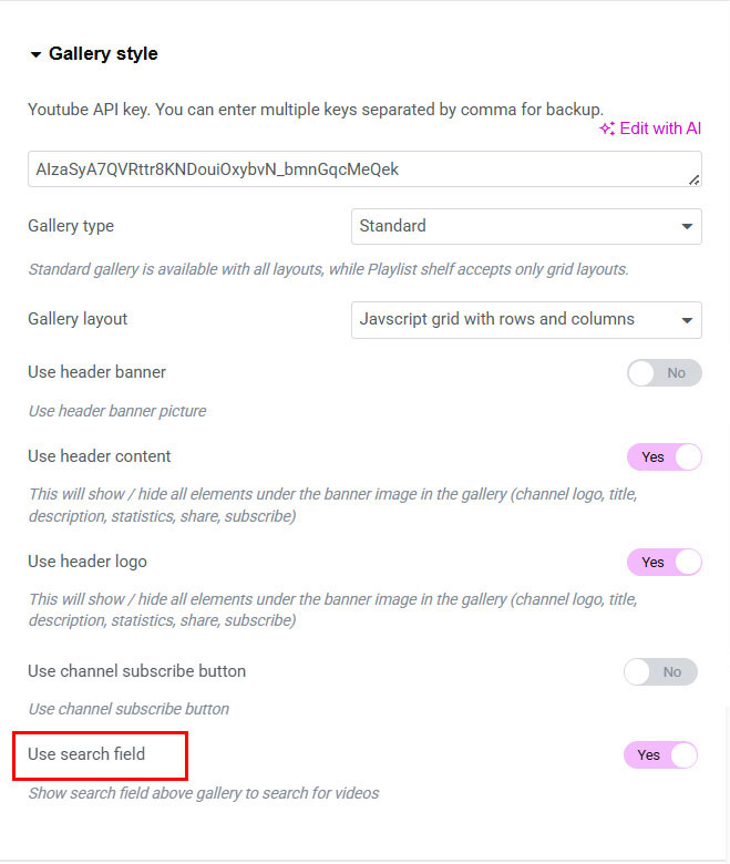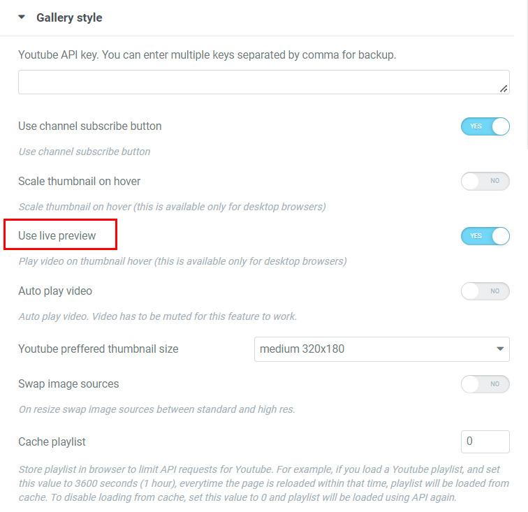 2. Add your Youtube api key in Gallery style tab: