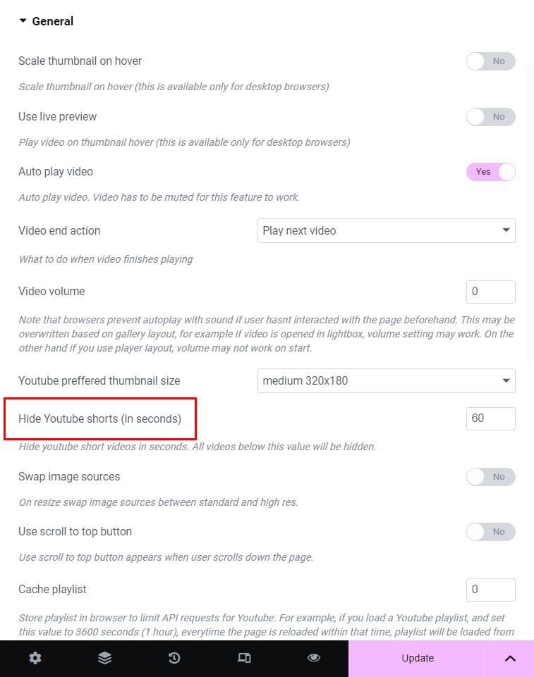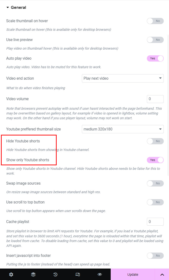 Use Hide Youtube shorts setting in Gallery manager / Gallery style tab