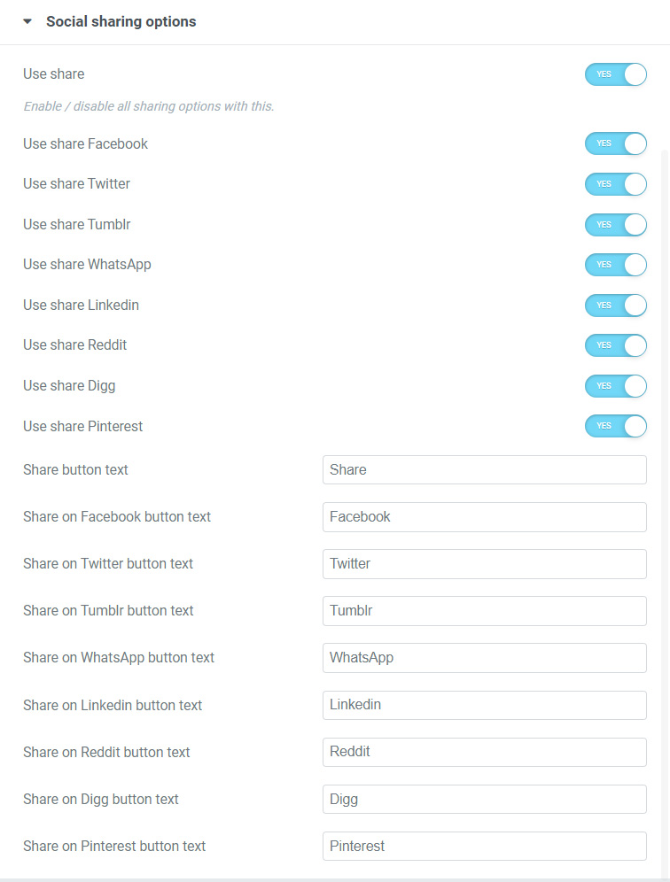 Other translate options are available in relevant tabs, like Social sharing or Youtube player custom skin tab.
