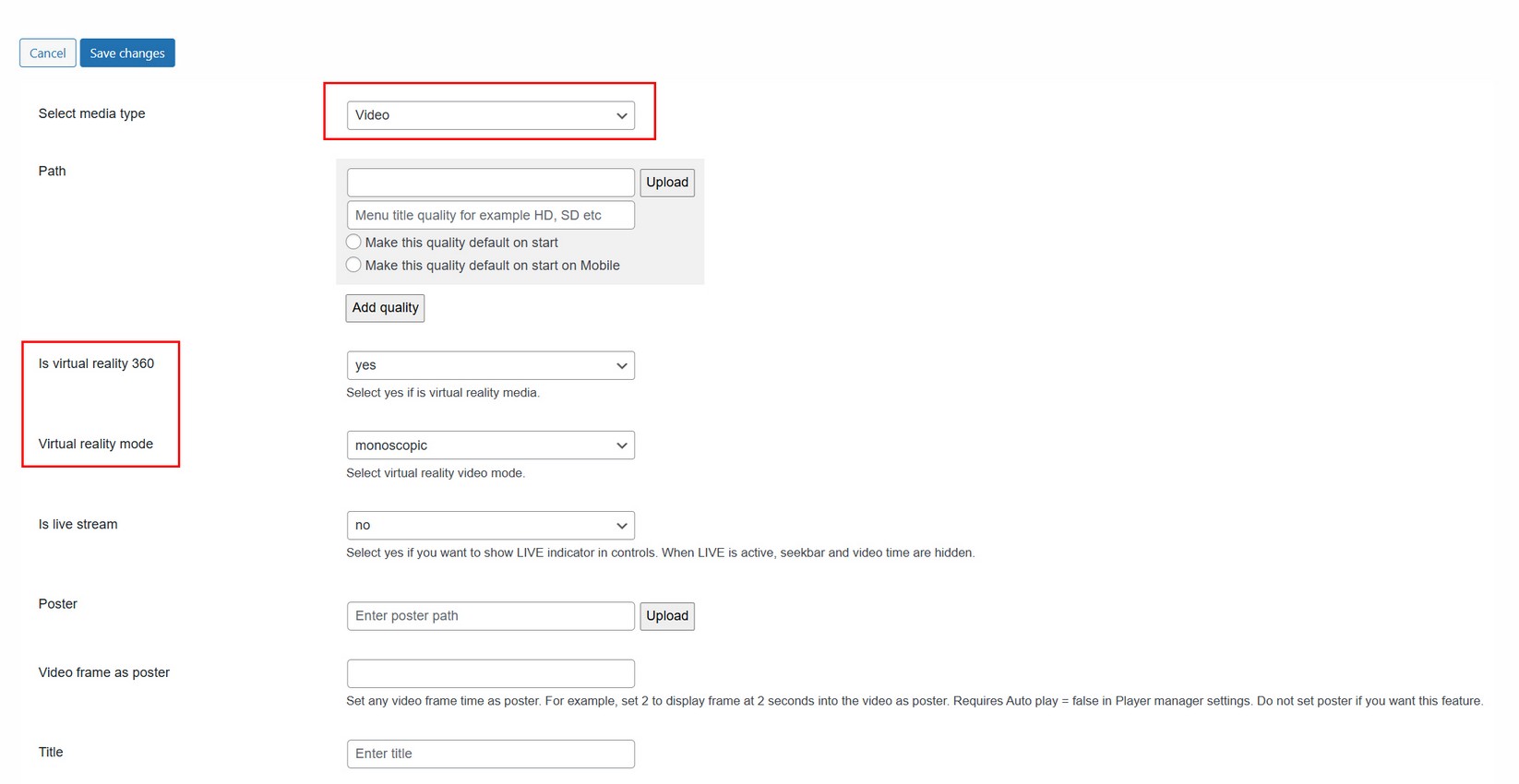 To add 360 video to Player, in Edit Playlist choose Add media, and choose video type: