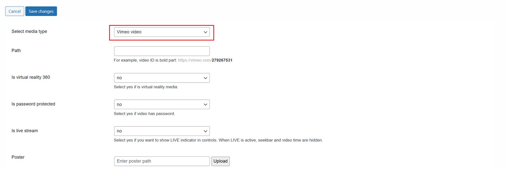 To add Vimeo single video to Player, in Edit Playlist choose Add media, and choose Vimeo video type: